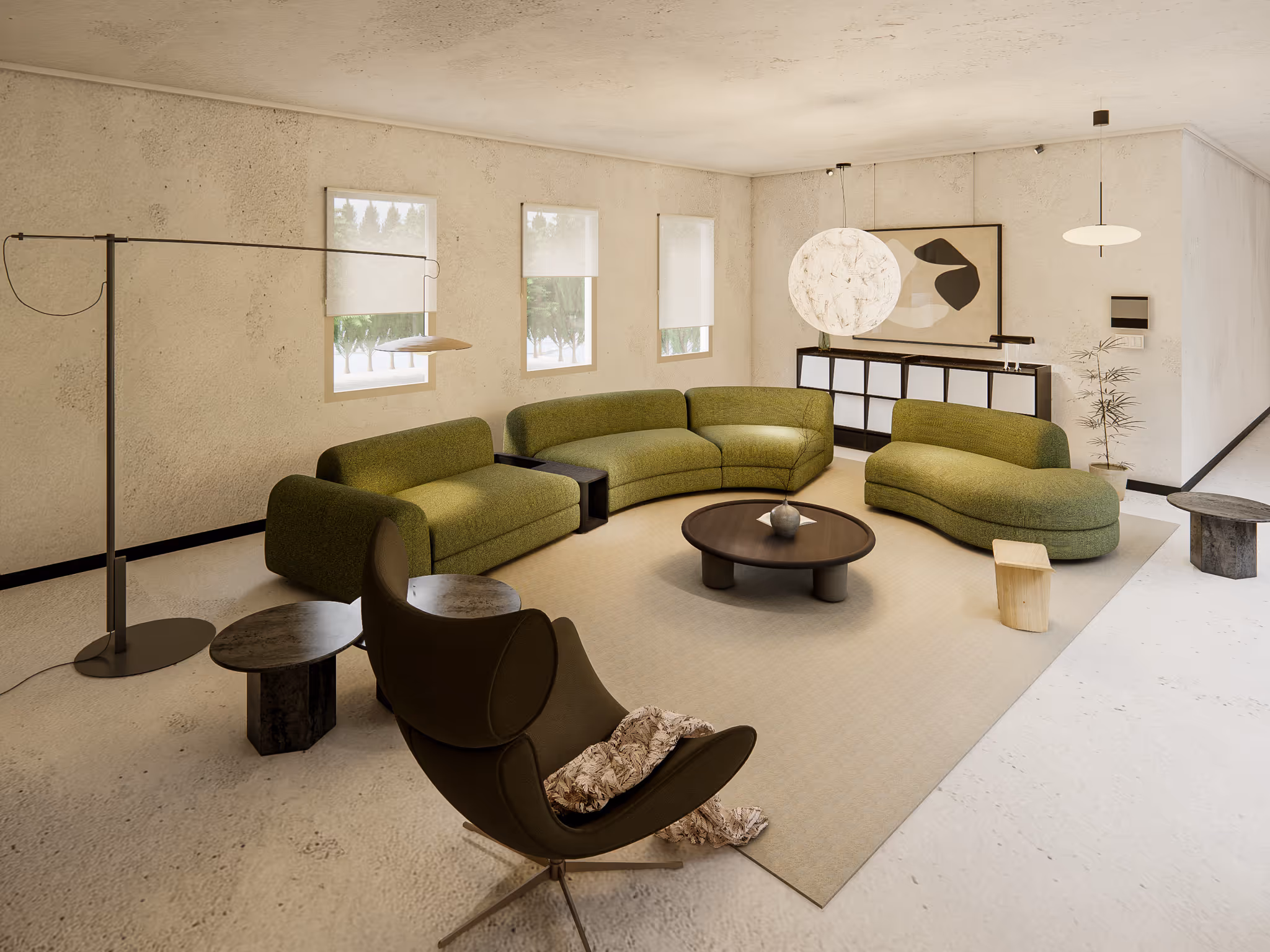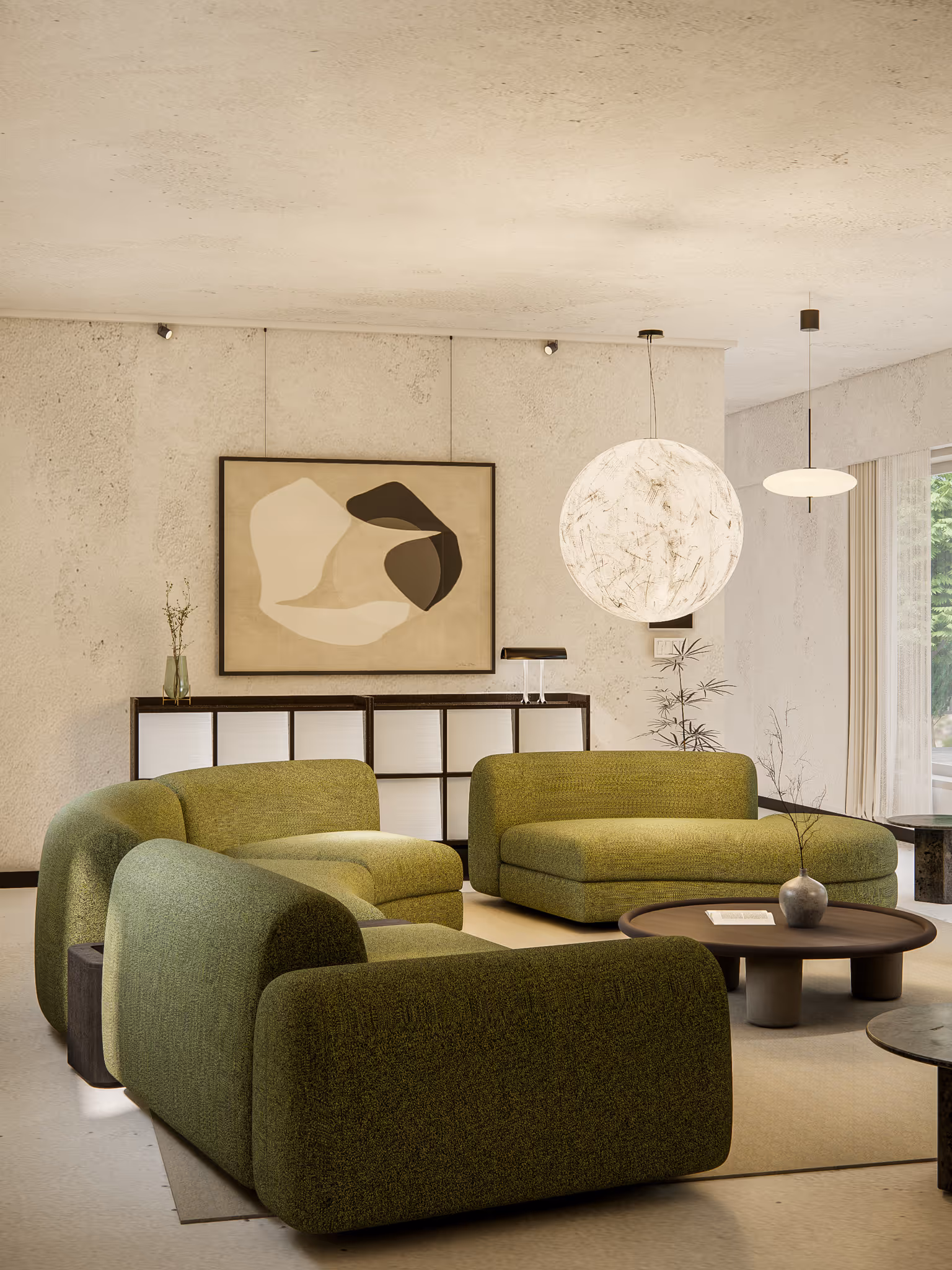 Here, serenity is sculpted into form. The sage-green modular sofa flows naturally with the architecture’s gentle curves, anchoring the room in both comfort and sophistication. Warm woods, tactile fabrics, and textured walls interlace to create a cocoon of balance, where visual stillness becomes as valuable as function.
