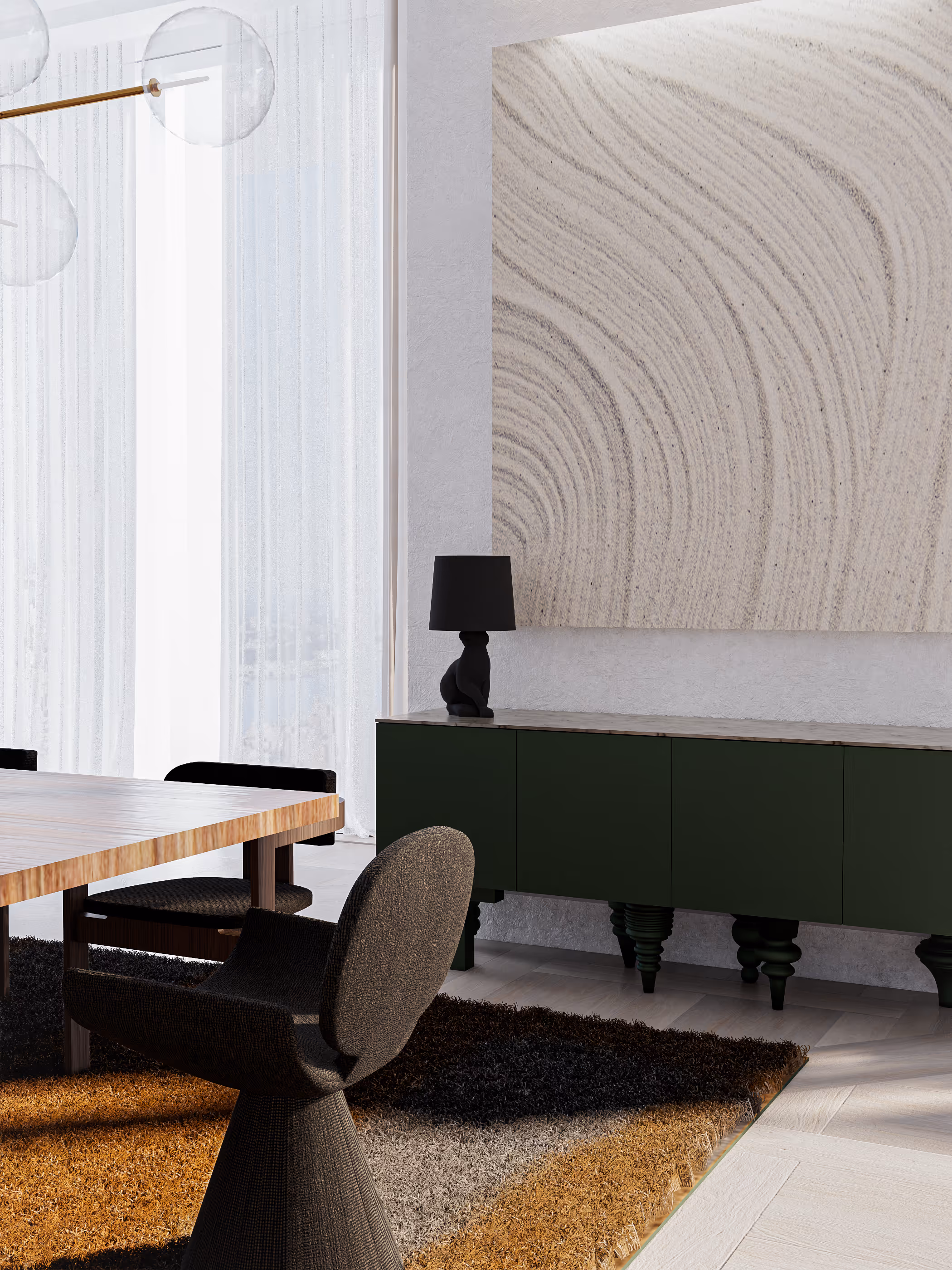 The client, a philanthropist and investor with a passion for modern art and timeless design, sought a dining experience that could balance intimacy with grandeur. Within this Luxury Residence, the dining room blends earthy greens, deep browns, and warm neutrals, reflecting both nature’s calm and New York’s energy. Each detail was selected to exude elegance, from Versace-inspired sculptural wall features to Roche Bobois-style contemporary chairs, creating a harmonious stage for gatherings and fine dining.