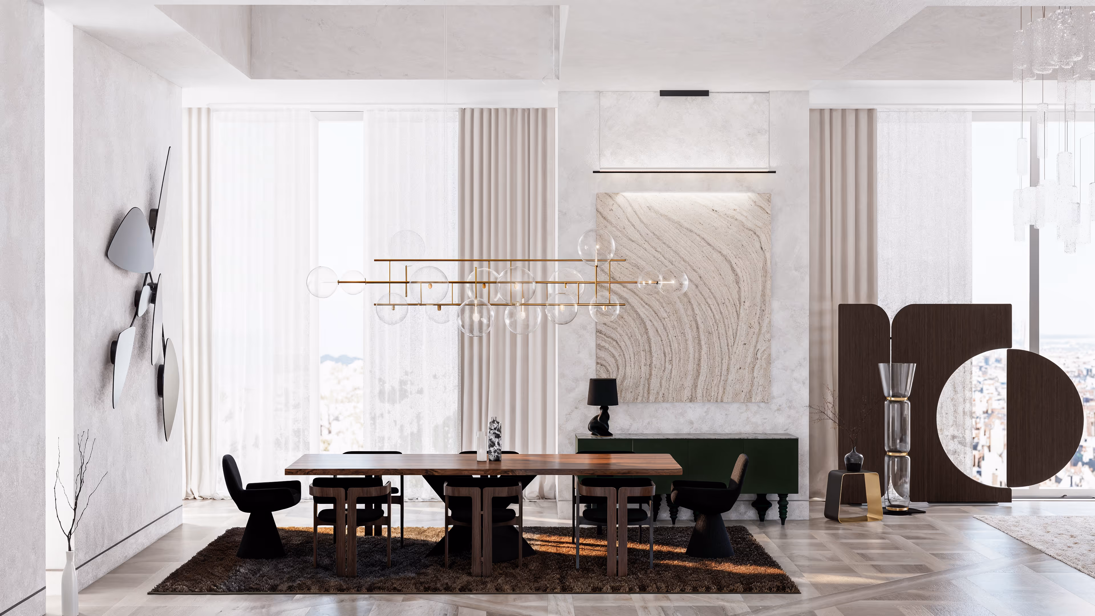 In the heart of Manhattan’s Billionaire’s Row, a global art collector calls 111 West 57th Street home. This New York Luxury Residence spans 7,130 square feet, embodying refinement with its Luxury Interior Design approach. The dining room, a carefully curated gallery-like environment, showcases sculptural lighting, walnut wood craftsmanship, and High-End Furniture selections from world-class luxury brands.