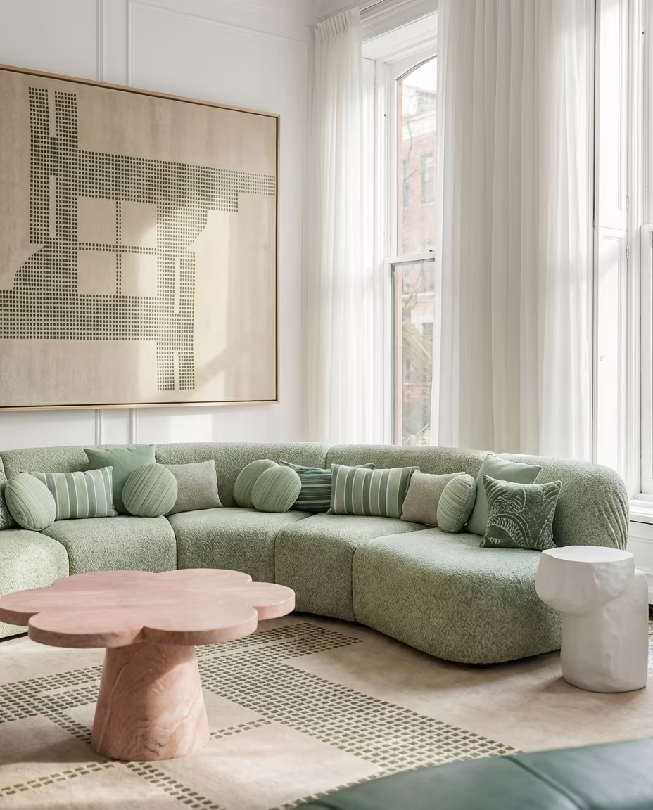 In particular, the overall impression of the space is defined by the curved sofa and lounge chairs, whose contemporary sculptural presence becomes the focal point of the room. Set against the classical backdrop, these fluid silhouettes soften the formality rather than reinforcing it, gently loosening the atmosphere and proposing a kind of luxury that feels both artful and comfortably livable a space that reads like a work of art, yet invites you to stay.
