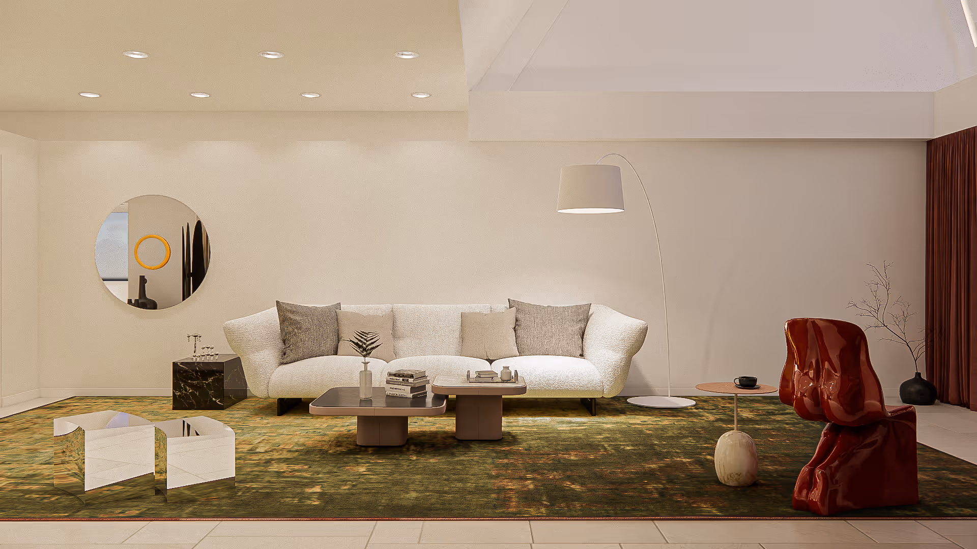 A white sculptural sofa anchors the seating area, complemented by a dramatic red accent chair—a conversation piece that bridges art and functionality. The olive-toned rug grounds the palette, reflecting shades of nature within the urban context. Curved elements, from the bespoke shelving unit to the organic lounge chair, infuse the space with rhythm, while polished finishes and metallic details add a whisper of luxury. The entire room is a masterclass in layering contrasts: light and dark, minimalism and drama, calmness and vibrancy.