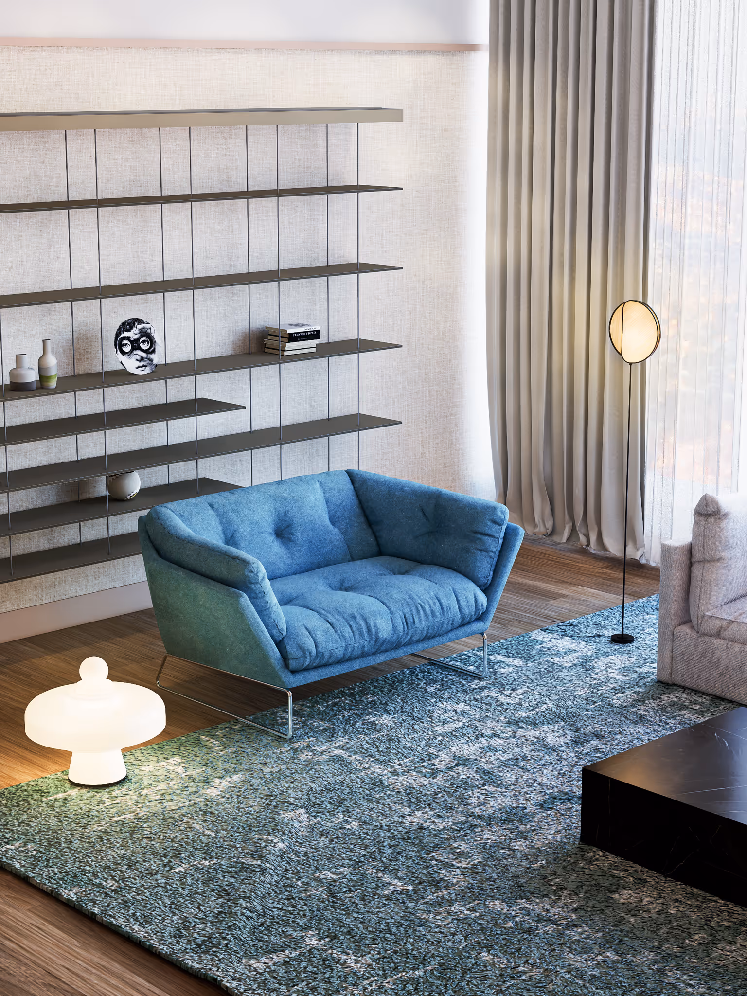 Shelving: Molteni&C Graduate Modular Hanging Bookcase – Conceived by Jean Nouvel, this wall-mounted shelving system exudes architectural clarity through its slender steel tie rods and candid simplicity. Adjustable plywood-aluminium shelves seem to float, producing a refined composition of lightness, versatility, and structural elegance.