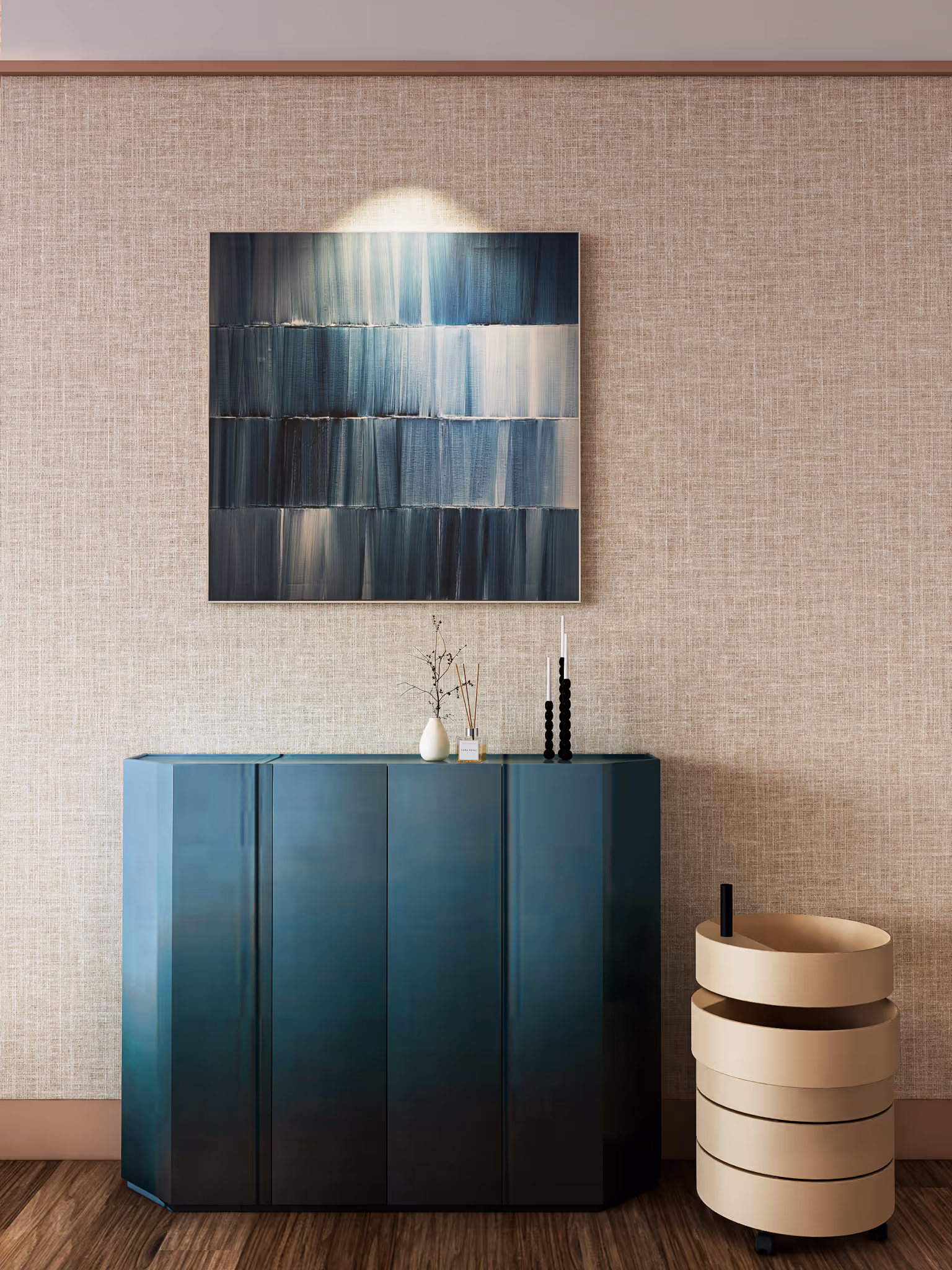 “The sculptural divider in brushed gold is my most treasured piece. It allows me to reshape the room instantly while reminding me of a gallery installation—living art in my home.”