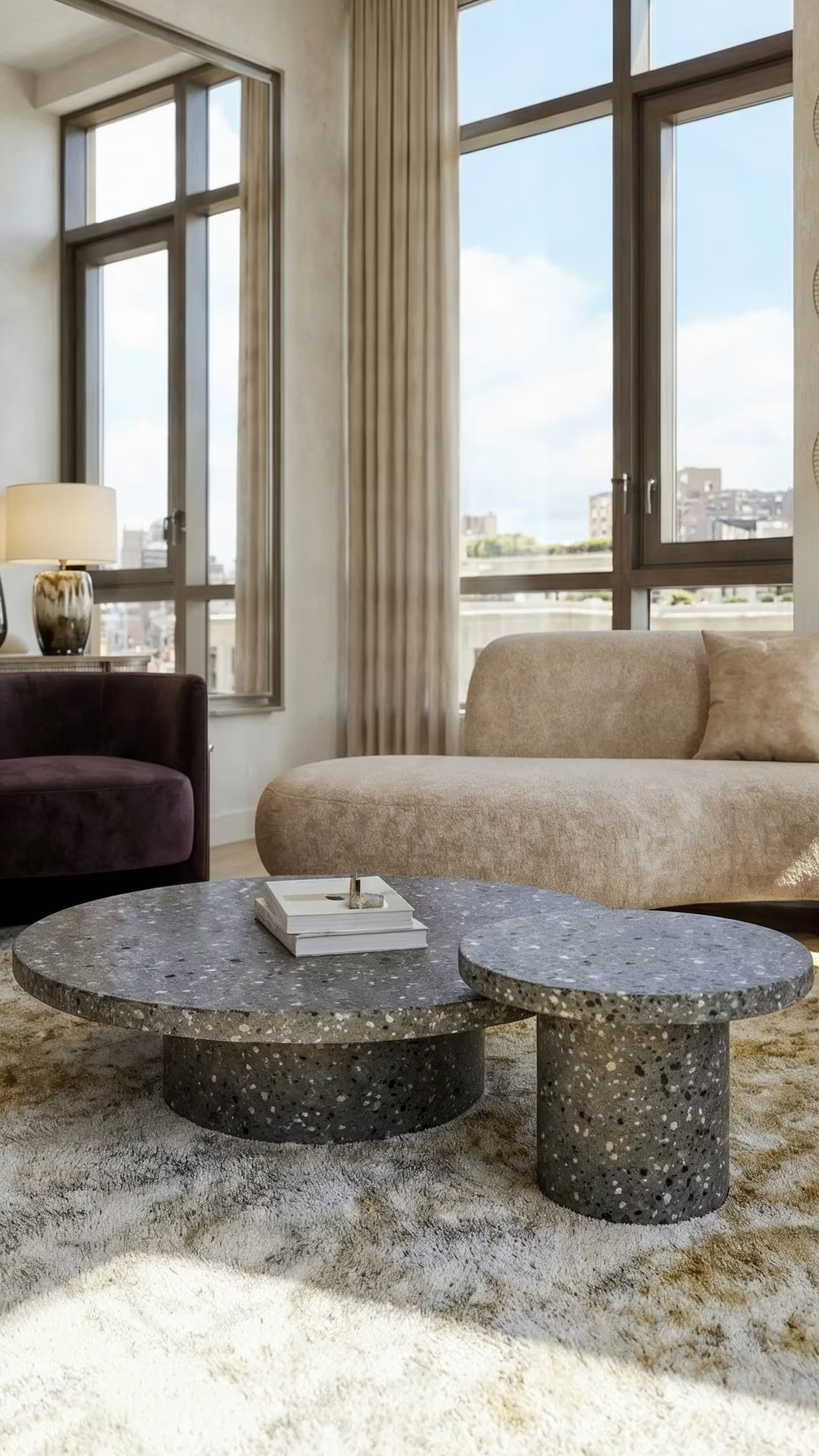 In front of the sofa, round coffee tables of varying heights and diameters were layered to create a flexible focal zone. The weighty stone-textured tabletop anchors the center of the space, while its form responds harmoniously to the curved sofa, reinforcing visual cohesion. Designed to be easily moved and reconfigured, the tables adapt fluidly to the resident’s lifestyle and daily routines.