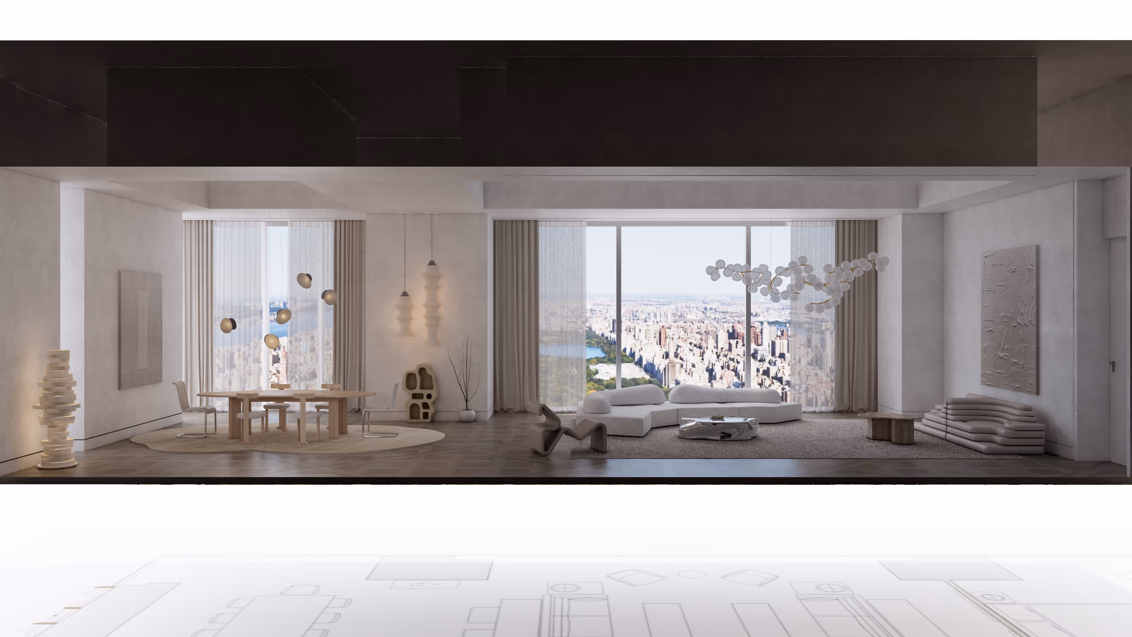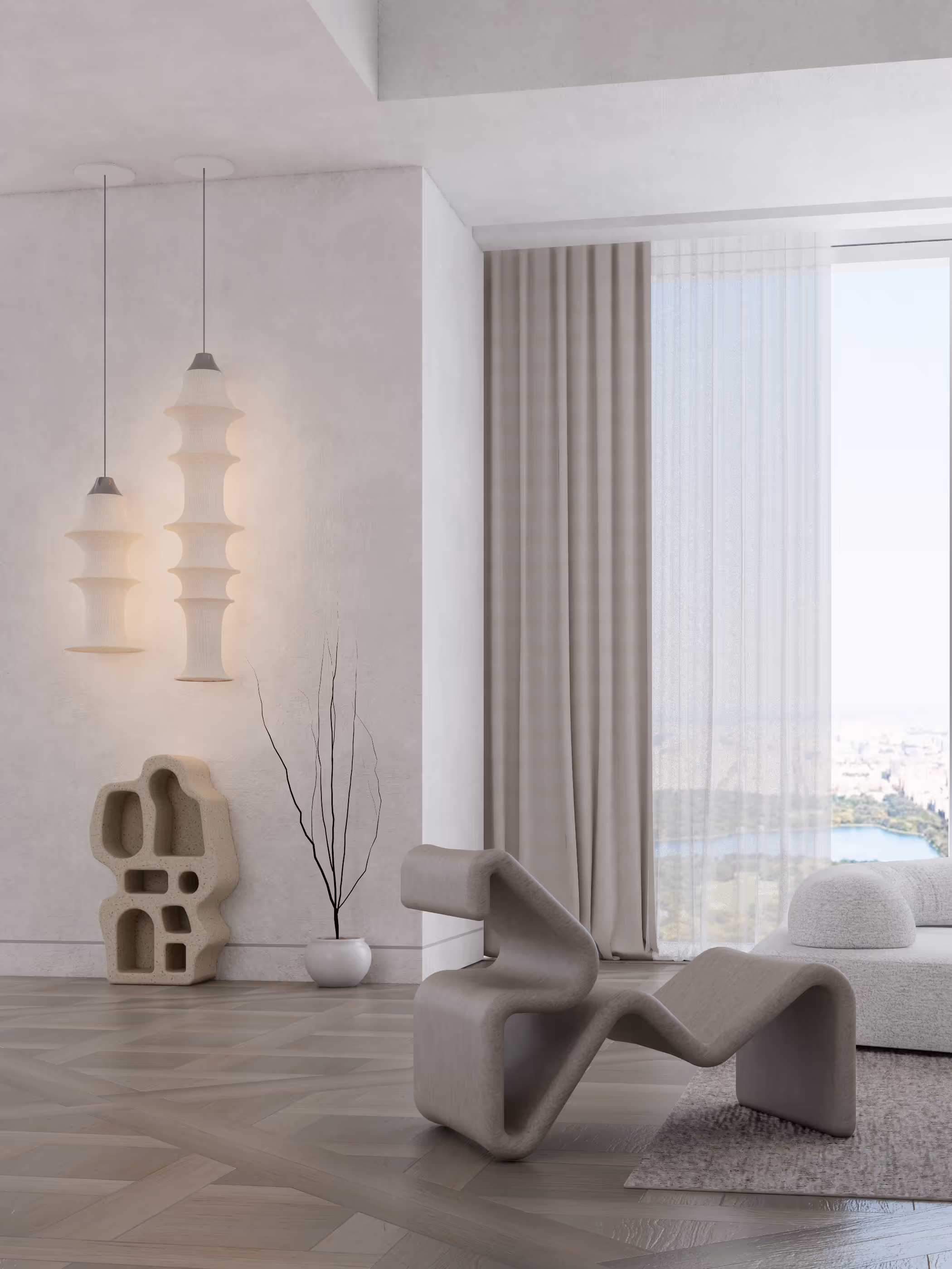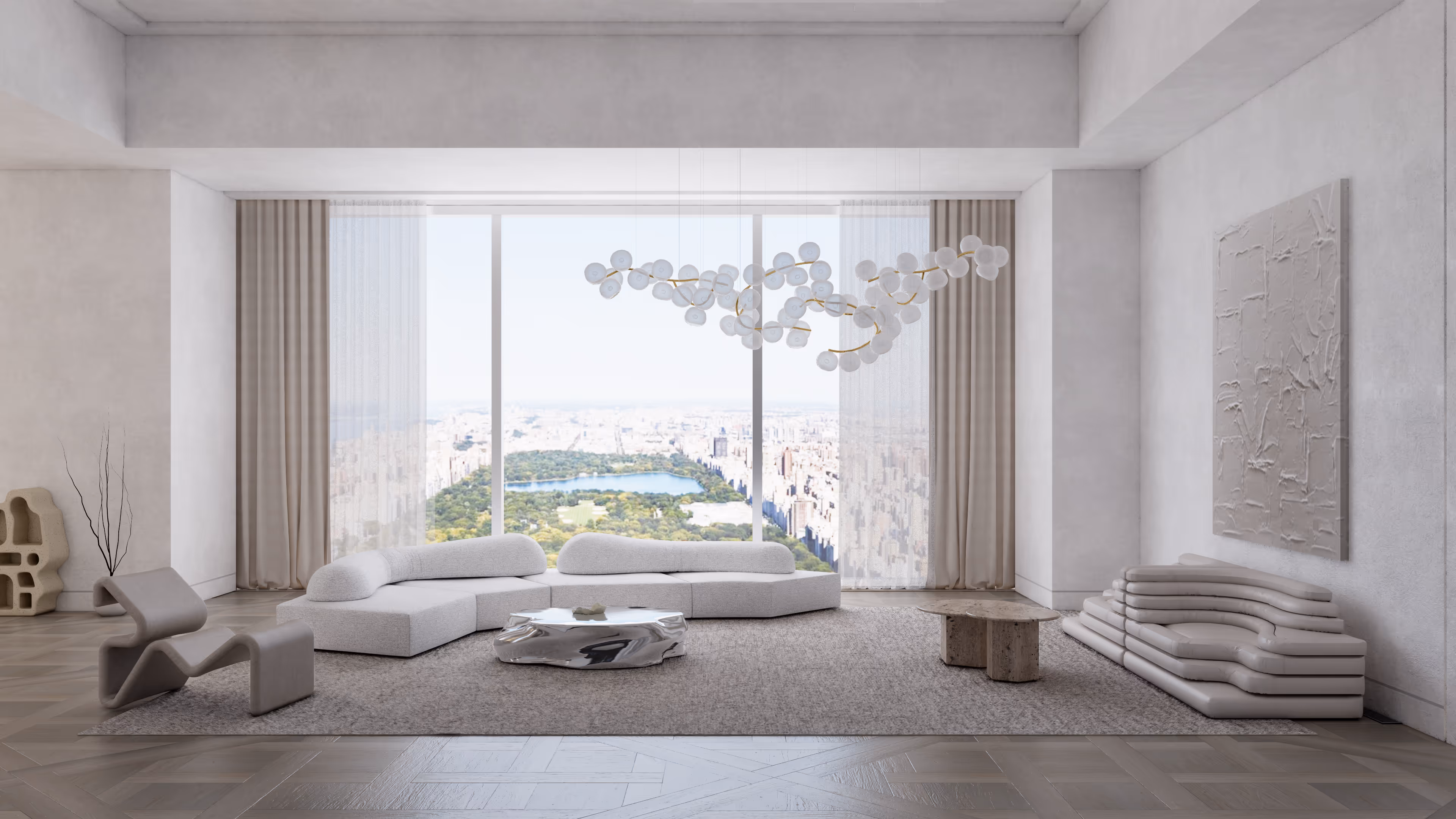 Luxury 7,130 SF minimal neutrals living room at 111 West 57th Street, NY with serene tones, sculptural design, and Central Park views.