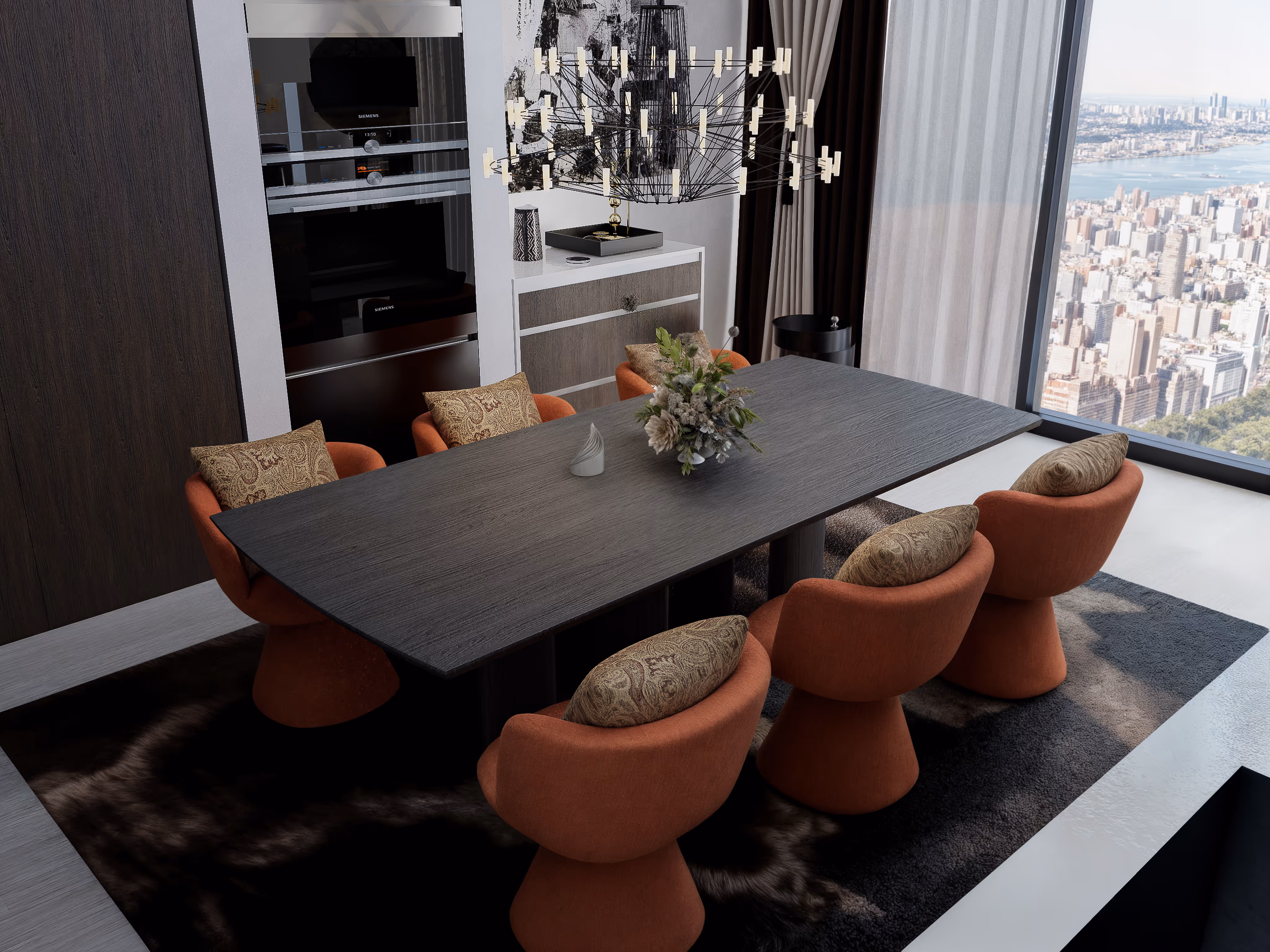 Every element was chosen to create layers of sophistication. Marble, dark wood, brushed metal, and fabric weave together in tactile dialogue. The result is a dining room that feels both structured and indulgent, heightened by the panoramic New York skyline view framed through oversized windows.