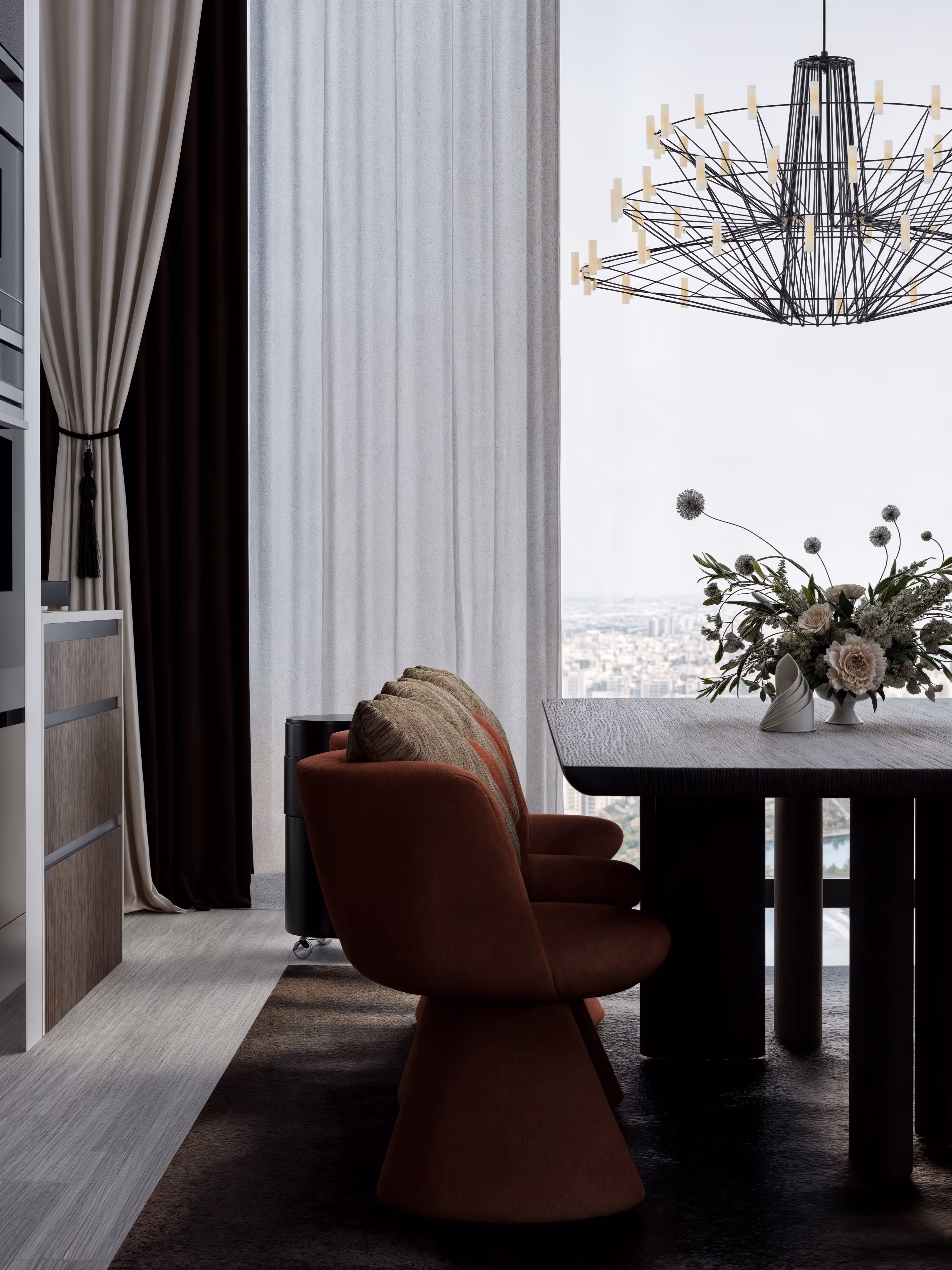 The design narrative unfolds as an interplay between structure and warmth. While the black and dark-wood dining table grounds the composition with its geometric lines, the curved reddish fabric chairs soften the mood, creating a balance between modern rigor and sensual comfort.