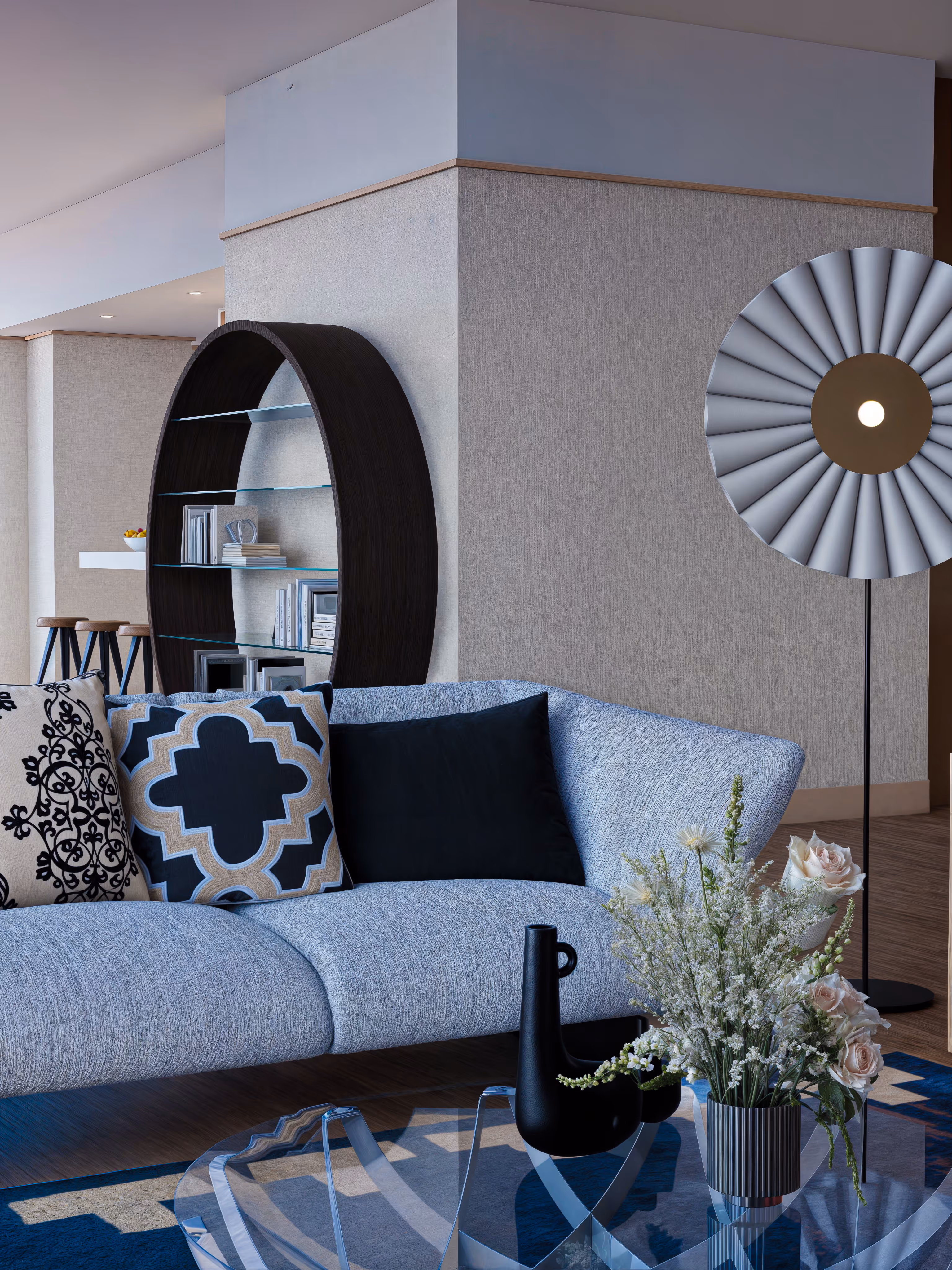 With an allocation of USD 65,000, the project balanced high-end investment pieces from Cassina, Vitra, and Roche Bobois with carefully curated accessories that elevated the narrative without overcrowding.