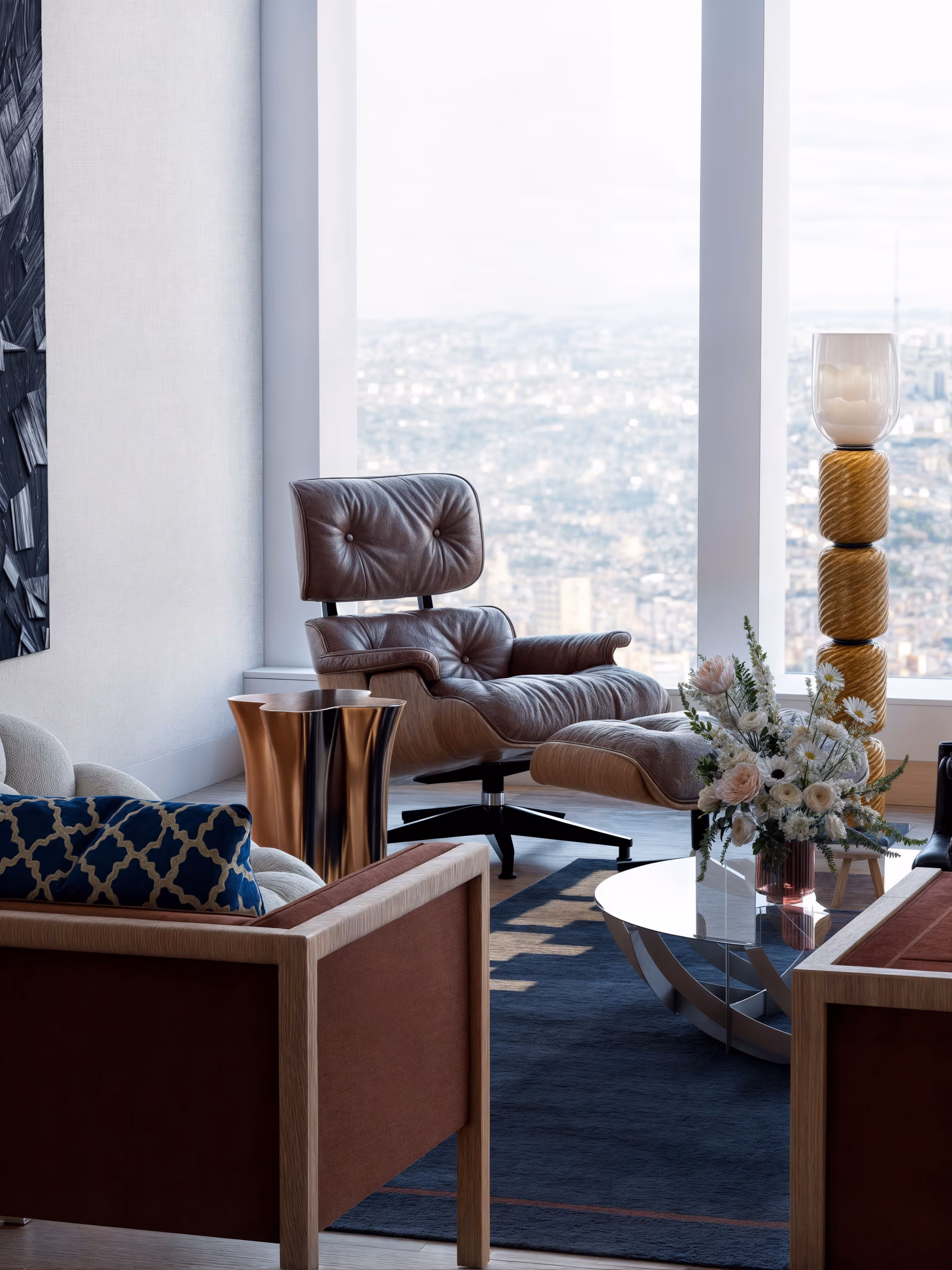 The narrative of this living room unfolds around the concept of “Artful Urban Escape”, where each element is designed to resonate with both comfort and sophistication. The panoramic window (