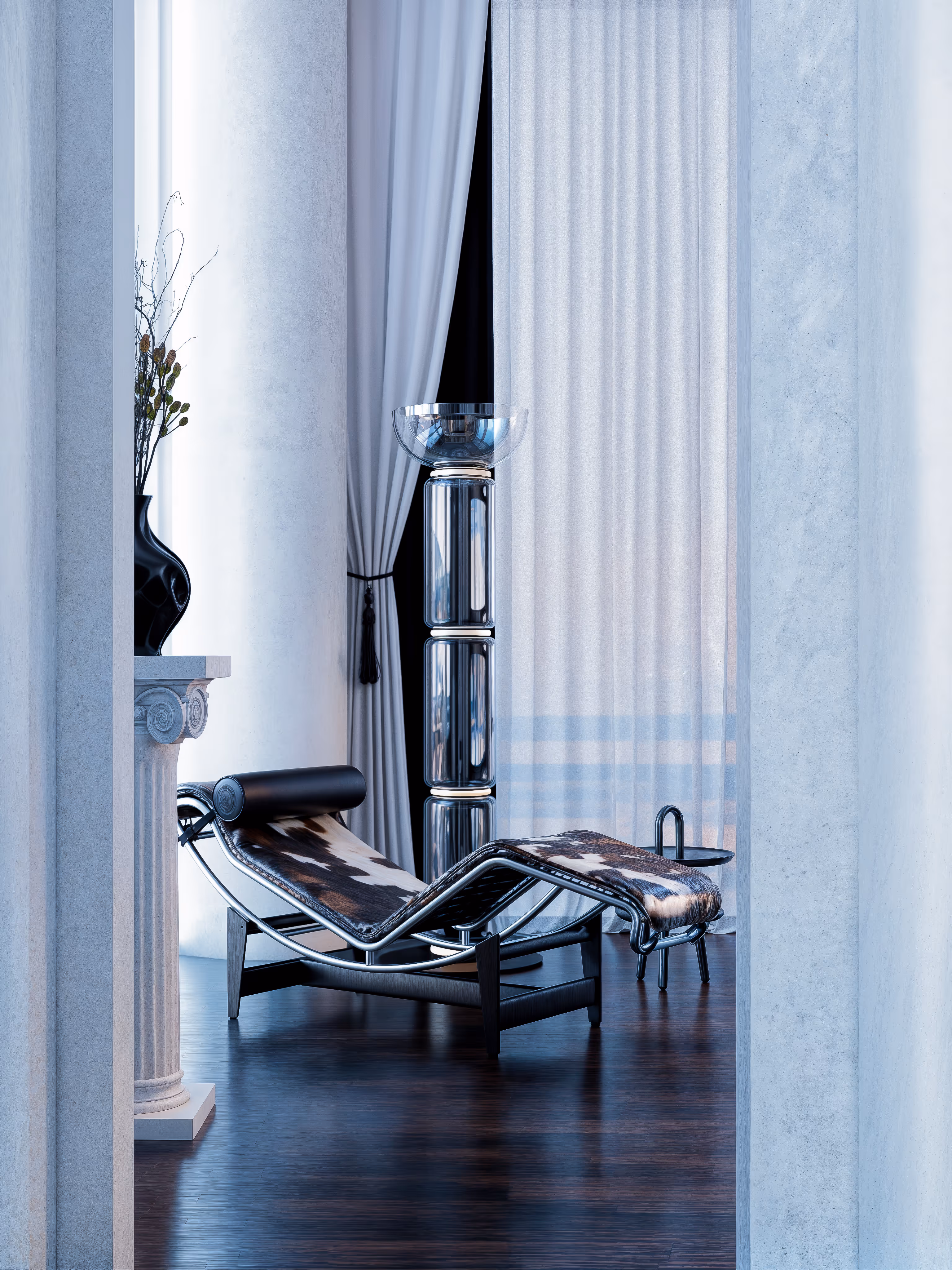 This living space transforms daily rituals into refined experiences. The Cassina LC4 Chaise Longue becomes the perfect retreat for evening reading or quiet reflection, while the modular sofa invites intimate conversations and family gatherings.