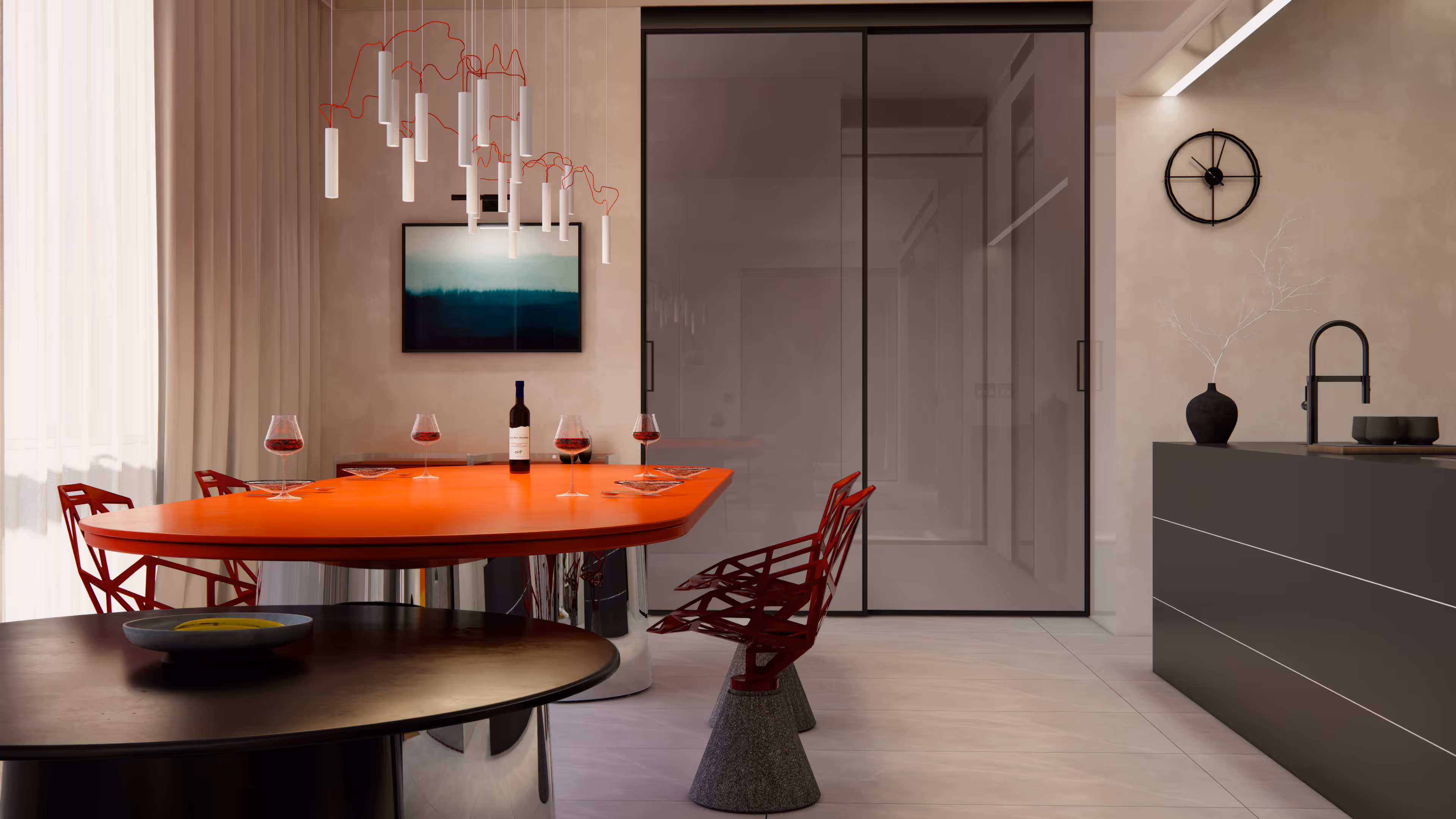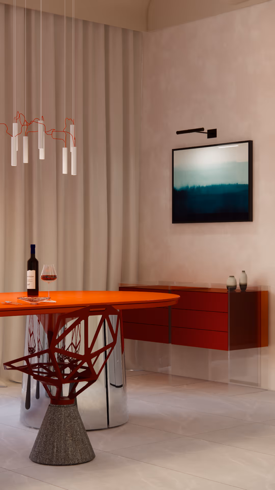 The dining room was conceived under the design ethos of sculptural radicalism and chromatic intensity. The vermilion oval dining table by Molteni&C appears to hover above its high-gloss metallic base, serving as the spatial anchor and commanding the room’s energy.