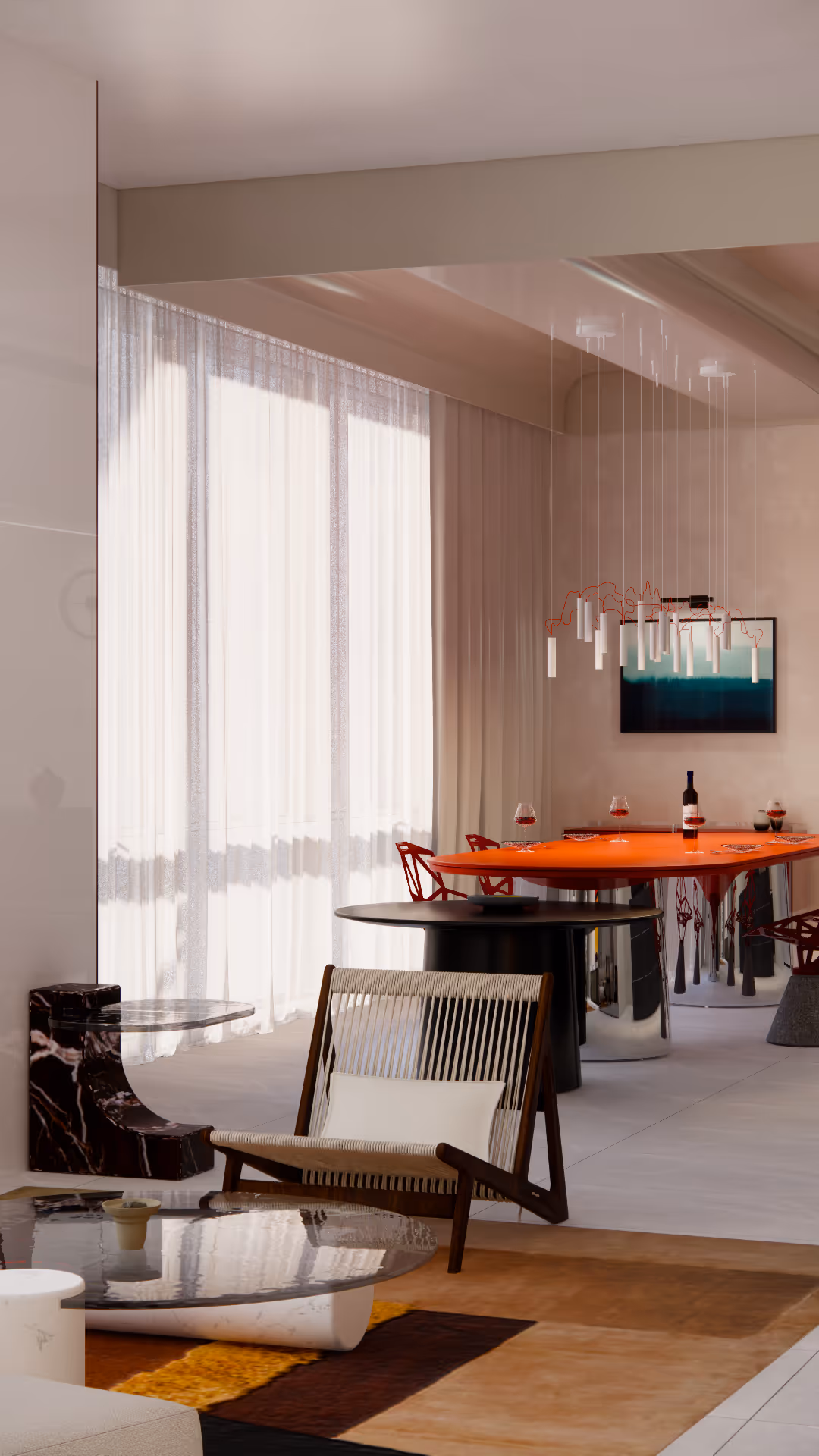The design narrative unfolds under the concept of “Modern Rich Dining with Artistic Accents.” The space demonstrates a seamless integration of sculptural form and functional refinement.