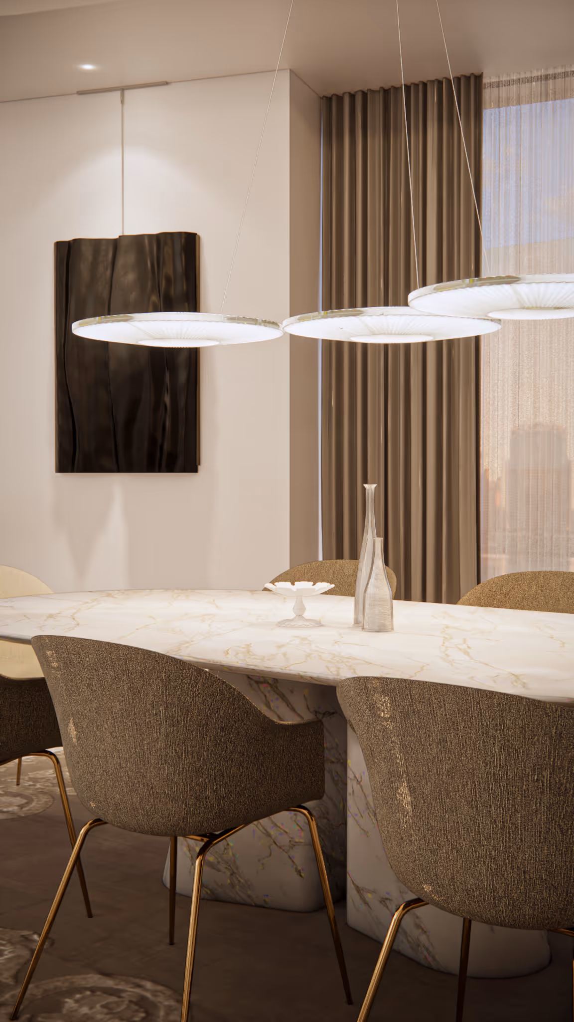 The design narrative is rooted in “Sculptural Harmony for Elevated Dining.” Far beyond its functional role, the dining room was envisioned as a curated gallery of textures and forms, where each element carries a distinct sculptural voice.