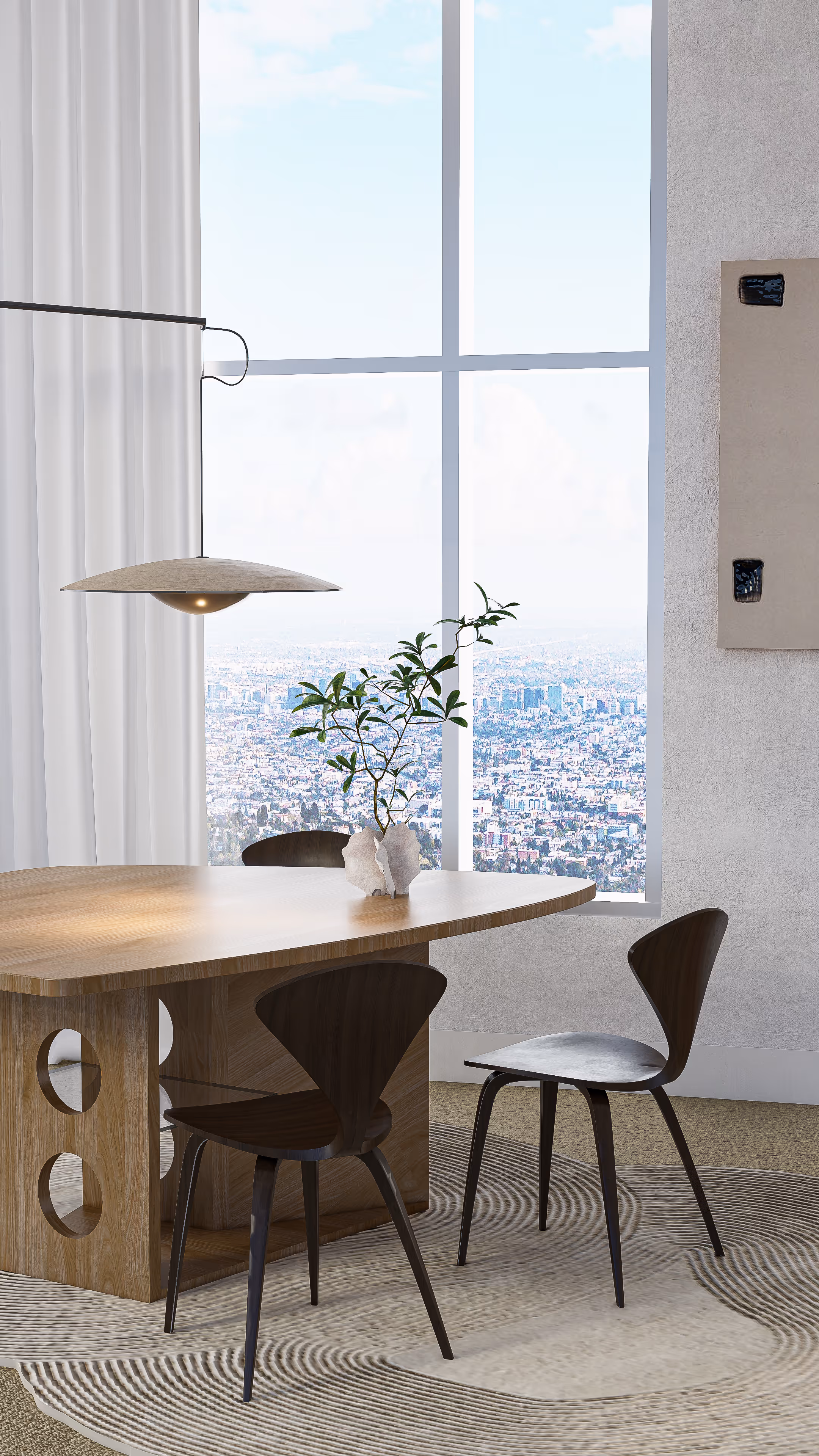 A large pendant light hovers above, diffusing soft illumination across the table’s surface. This light is more than functional; it introduces an atmosphere of calm, softening the sharp architectural lines of the room. Natural daylight streams through floor-to-ceiling windows, expanding the visual depth and offering panoramic views of the Los Angeles skyline. White walls frame the space, while warm wood cabinetry and subtle metallic accents ground the minimal composition in timeless elegance.