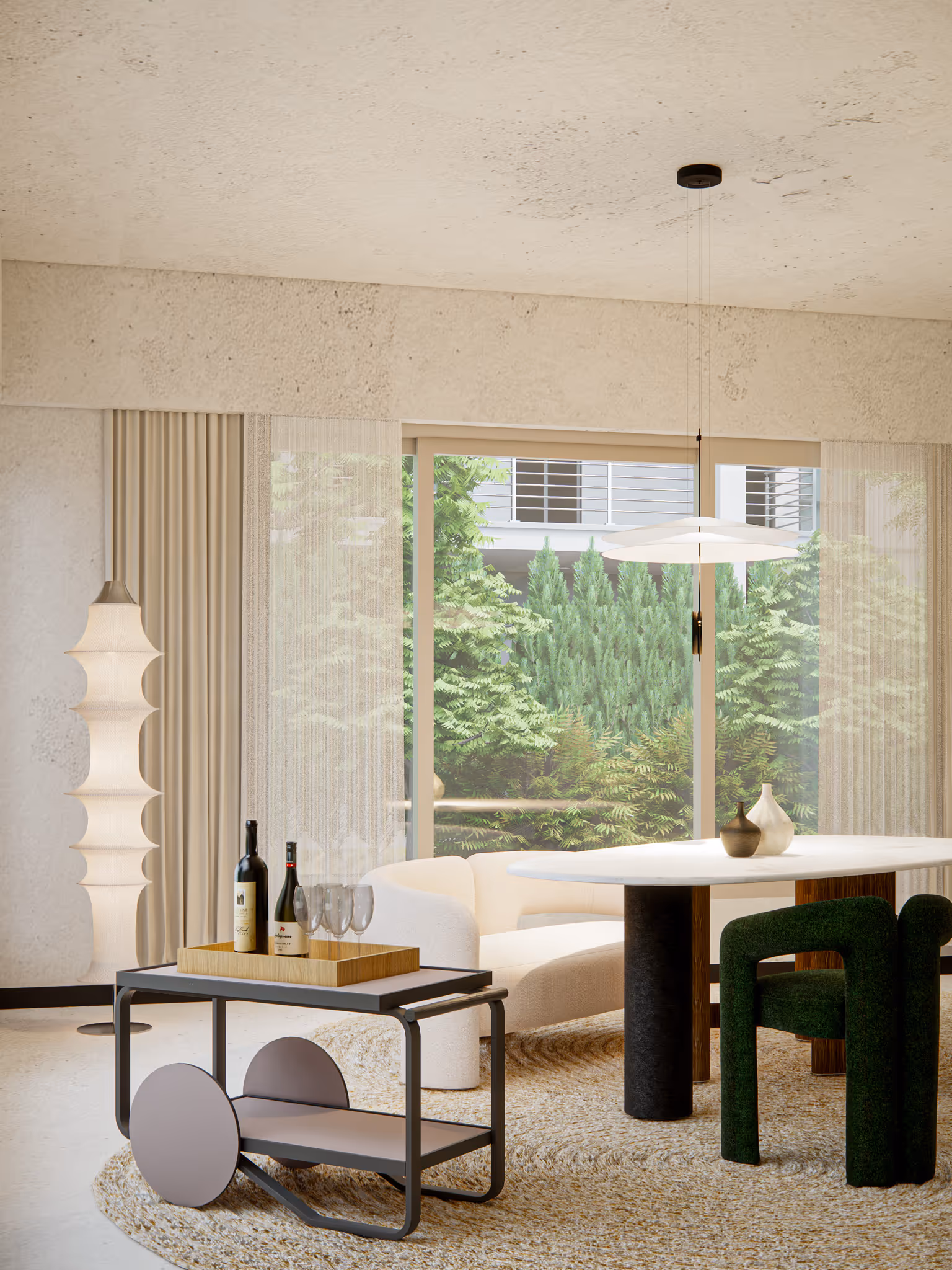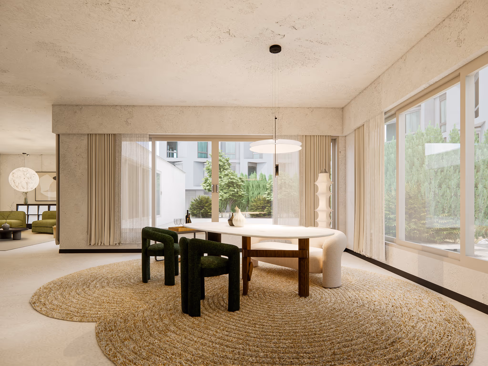 The space embraces slow living, where sculptural furniture meets natural textures, and intimacy is celebrated through design. With its serene palette, gallery-like details, and refined elegance, this dining room invites moments of connection and timeless artistry.