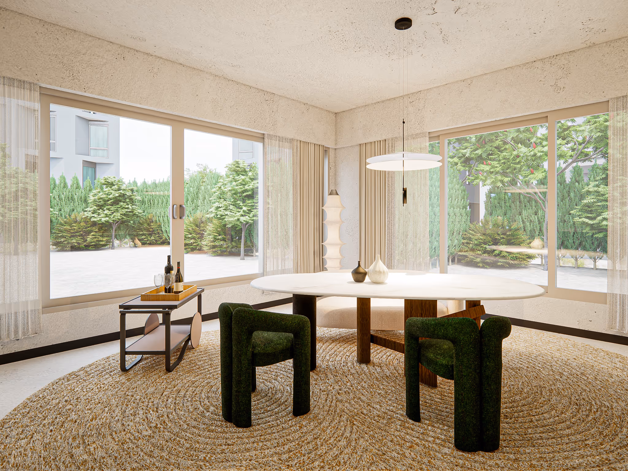The design narrative is titled “Curated Setting for Slow Gatherings.” Far from being a utilitarian space, the dining room is conceived as a refined stage for intimacy and artful living. A sculptural white table becomes the centerpiece, paired with deep green chairs that anchor the room’s rhythm. The textured circular rug, grounding the ensemble, adds continuity and tactile warmth.
