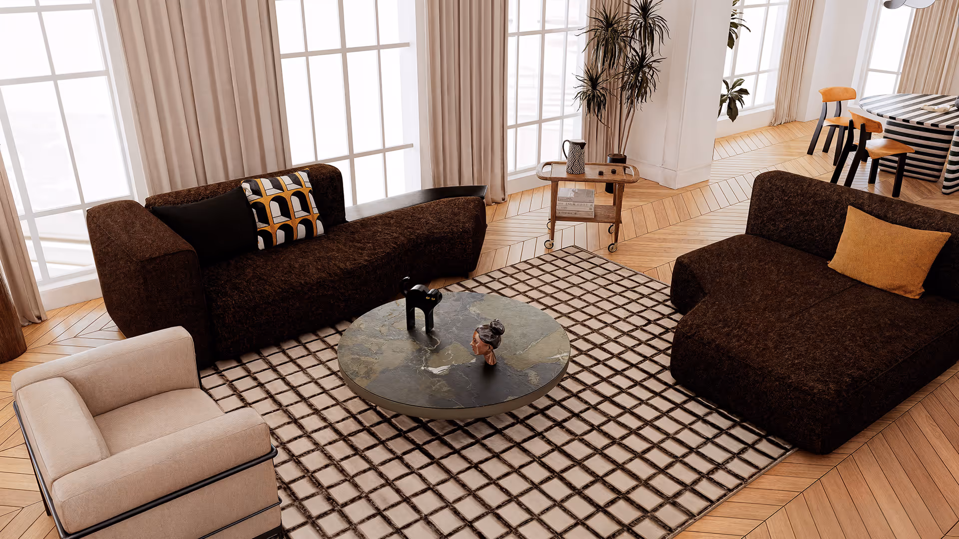 At its heart is a deep brown fabric sofa that brings both warmth and tactile richness to the space. Its textured upholstery enhances visual softness, inviting residents and guests into an atmosphere of ease and welcome. The brown serves as the anchoring tone within a broader neutral palette of beige, ivory, and natural wood, achieving visual harmony and a grounded elegance.