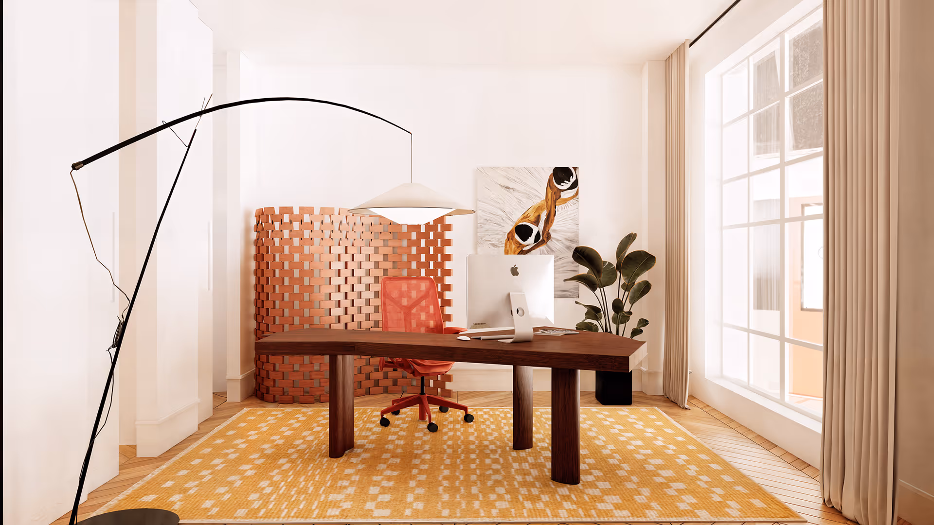 The design narrative unfolds with a balance of clarity and vibrancy, where white walls and abundant daylight frame a modern composition. At the center stands a dark wood linear desk—a stabilizing anchor of focus—while a red mesh Herman Miller chair injects a striking creative energy. The yellow patterned rug echoes this vitality, softening the geometry with warmth.