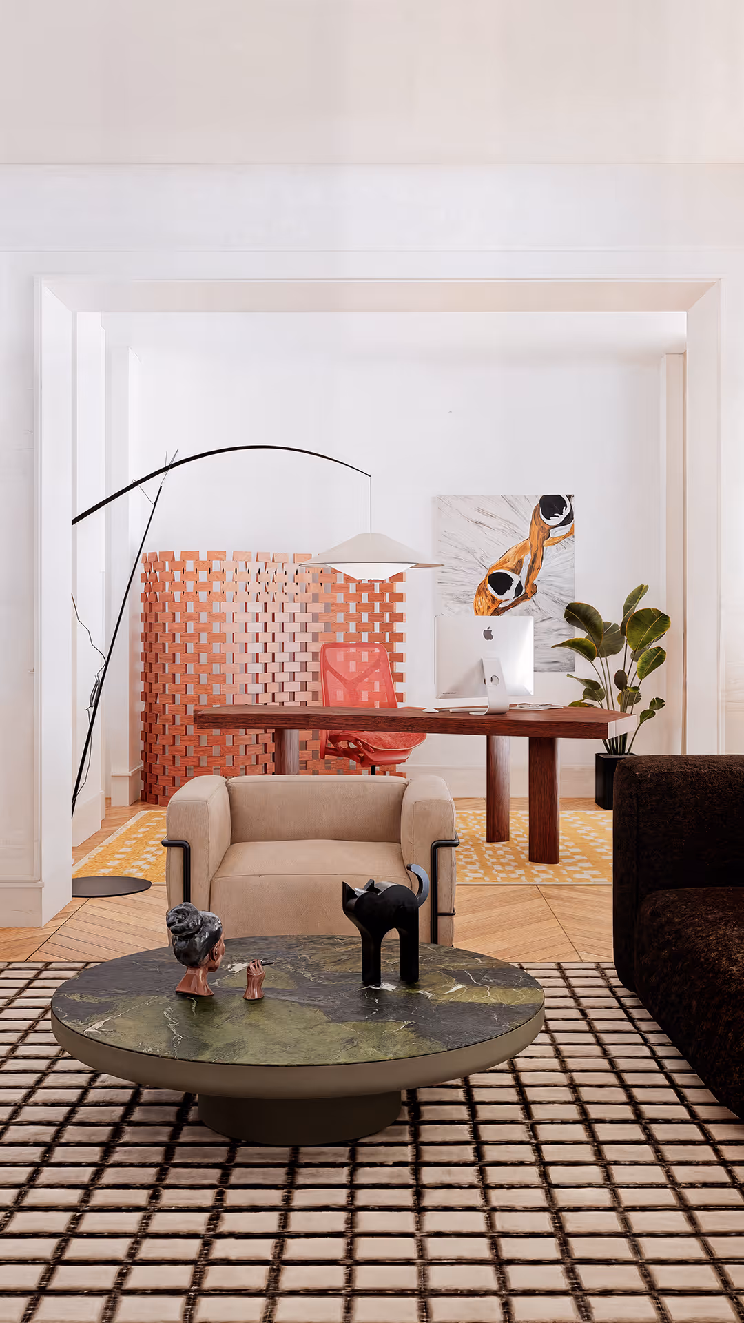 A brick-patterned partition functions as both divider and artwork, reminiscent of Cassina’s Paravent Ambassade du Japon.